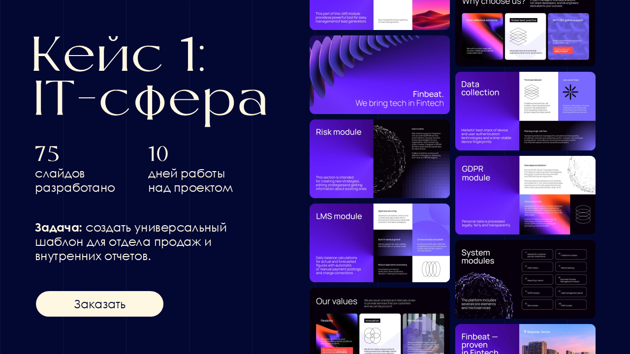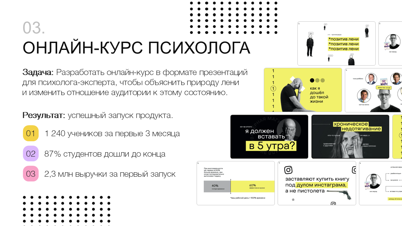 Не добавляйте в портфолио все свои работы. Отберите 5–7 лучших работ и глубоко раскройте их. Разместить на слайде фото недостаточно. Здесь ваша задача рассказать о целях, объеме, сроках и результате работы. Помните: качество важнее количества.