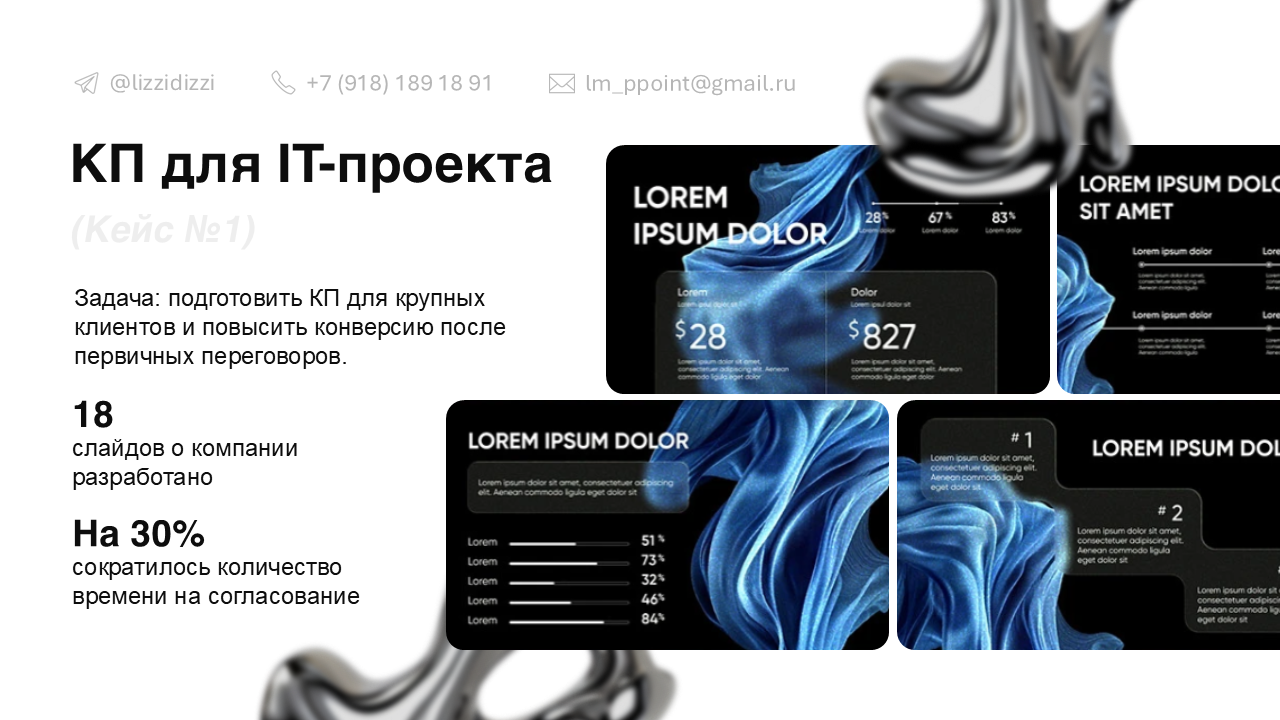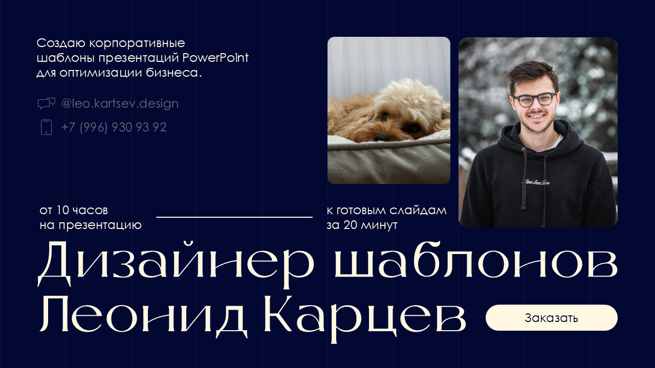 Титульный слайд есть в каждом портфолио. Начнем с очевидного. Оптимальное наполнение здесь выглядит так: имя и фамилия, должность, контакты и краткое описание. В нем вы можете рассказать о нишах, с которыми работаете или о чертах, которые отличают вас от конкурентов. Не забудьте добавить фото, это повышает доверие. Так клиенту проще ассоциировать портфолио с реальным человеком.