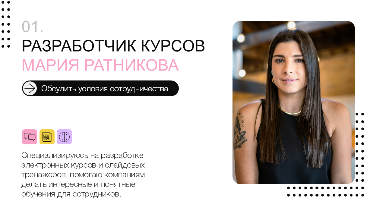 Мы подготовили примеры, чтобы рассмотреть портфолио из разных сфер. Знакомьтесь с нашими героями: дизайнерка коммерческих предложений Лиза, создатель корпоративных шаблонов Леня и разработчица курсов Маша.