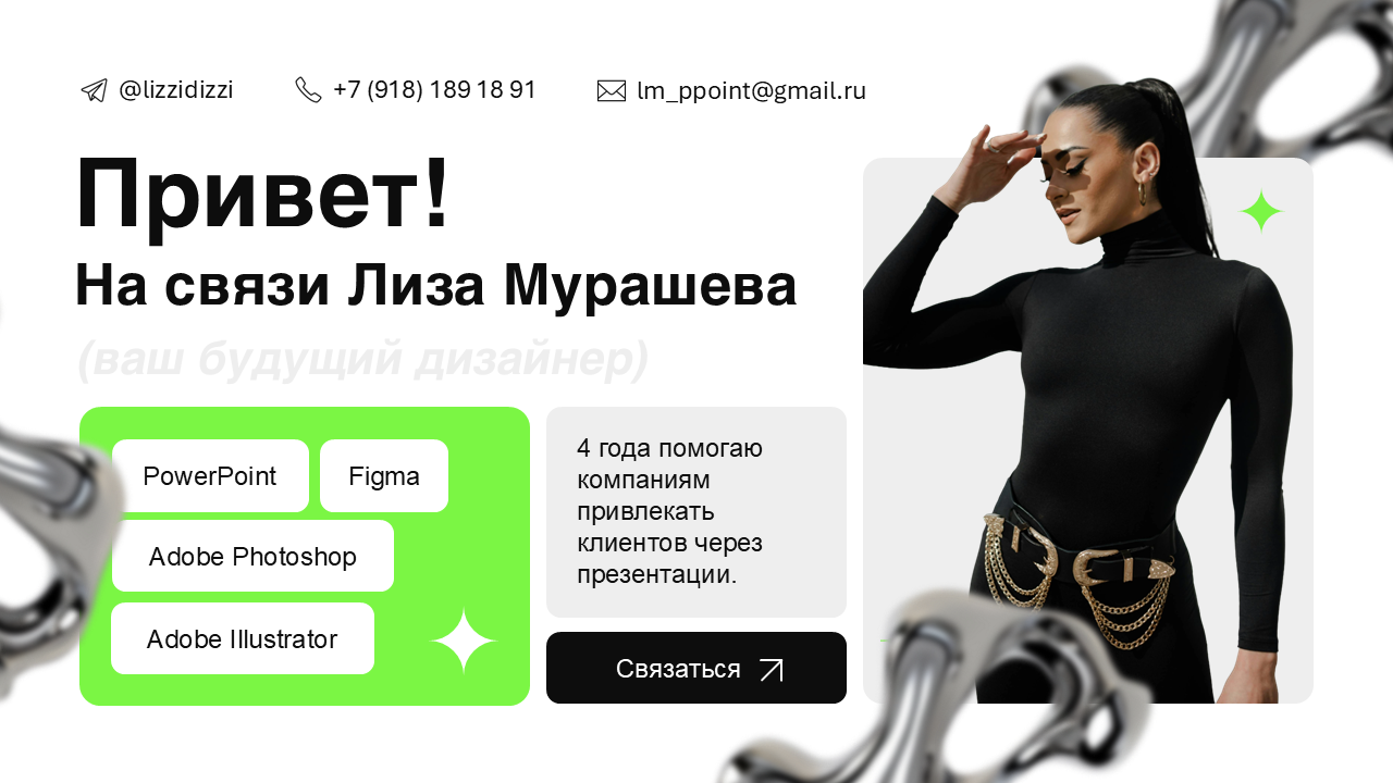 Завершаем нашу презентацию СТА. Клиент может сталкиваться с портфолио впервые и не знать, что ему делать дальше. Лучше напомните, как с вами связаться, от этого клиентов не теряют. Еще раз добавьте контакты для связи или кнопку, кратко резюмируйте в чем польза вашего партнерства.