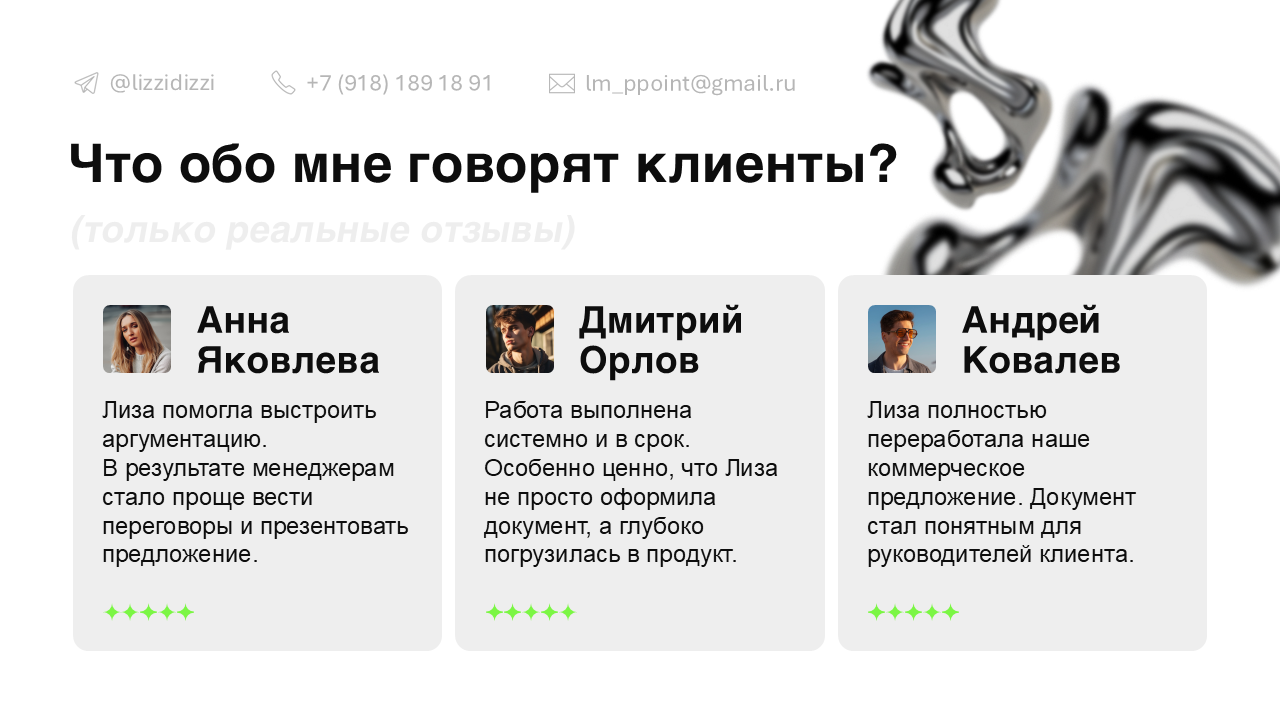Показать свои умения — важно и круто. Но не забывайте: в сотрудничестве ключевую роль играет доверие. Помните, мы начали его формировать фотографией на титульном слайде? Его нам важно подкрепить отзывами.